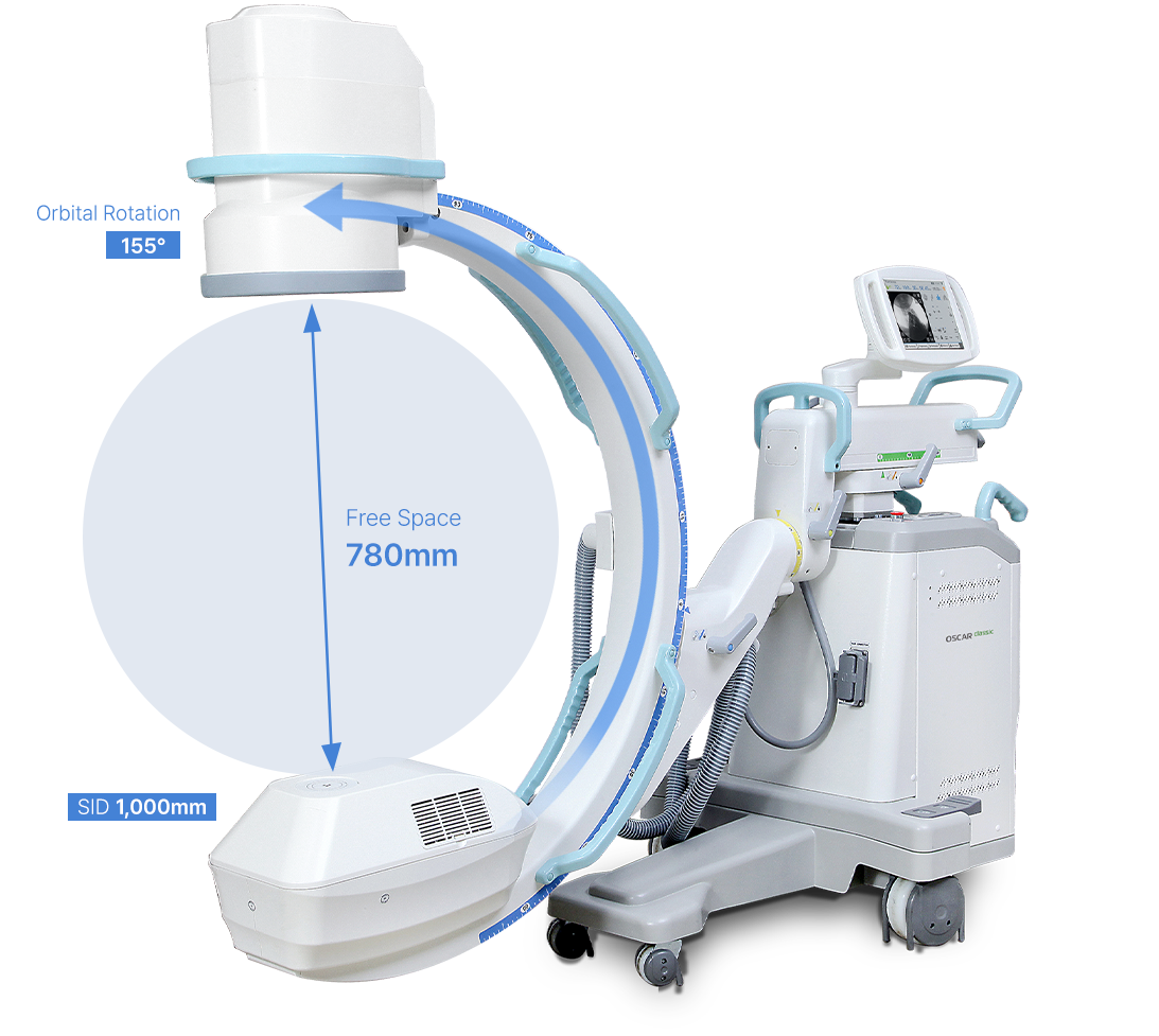 780mm free space and 155º orbital rotation provides convenient operation environment for operator.